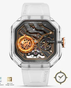 A Skeleton watch with a versatile 39mm case, that suits most wrists, crafted from resin featuring a black dial with a unique brushed-metal open-worked/skeletonized finish and a helpful power reserve indicator.
