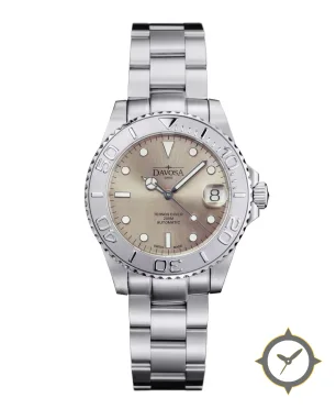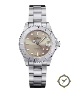 A Dive watch with a vintage-inspired 36.5mm case, crafted from stainless steel featuring a brown dial with a unique sunburst finish.