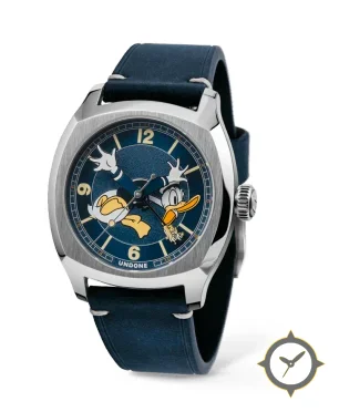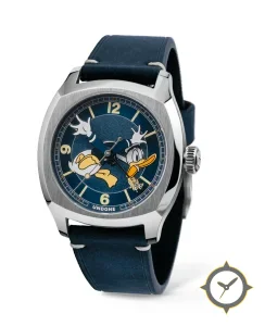 A Vintage watch with a versatile 41mm case, that suits most wrists, crafted from stainless steel featuring a blue dial with a unique textured/grainy matte with printed character motif finish and a true GMT complication for tracking a second time zone.