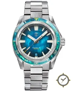 A Dive watch with a vintage-inspired 36mm case, crafted from stainless steel featuring a blue dial with a unique mother-of-pearl marbled (abalone-like) finish.