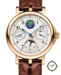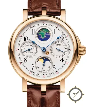 A Dress watch with a bold 45.5mm presence on the wrist, crafted from gold featuring a silver dial with a unique matte-silver finish, perfect for the global traveler with its world-time function.