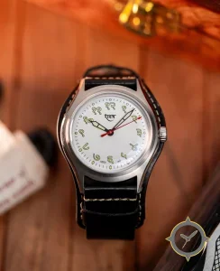 A Field watch with a bold 44.5mm presence on the wrist, crafted from stainless steel featuring a white dial with a unique matte finish.