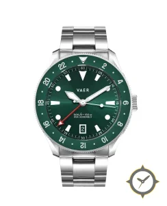 A GMT watch with a vintage-inspired 36.5mm case, crafted from stainless steel featuring a green dial with a unique sunburst finish and a true GMT complication for tracking a second time zone.