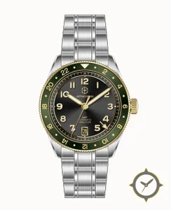 A GMT watch with a versatile 40.5mm case, that suits most wrists, crafted from stainless steel featuring a black dial with a unique sunburst (radial) finish and a true GMT complication for tracking a second time zone.