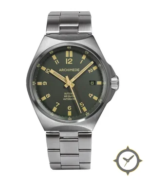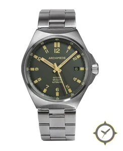 A Field watch with a vintage-inspired 34.5mm case, crafted from stainless steel featuring a green dial with a unique matte finish.