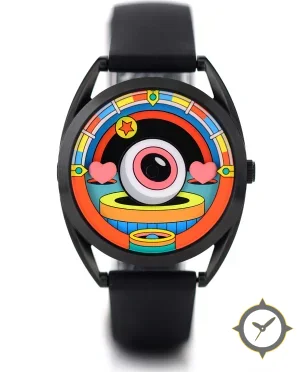 A Digital watch with a versatile 39.5mm case, that suits most wrists, crafted from stainless steel featuring a black dial with a unique flat lacquered pop-art graphic finish.