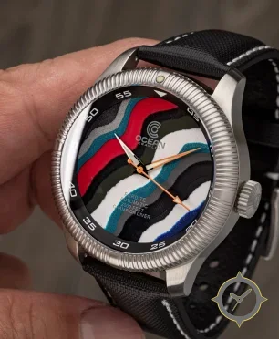 A Dive watch with a bold 46mm presence on the wrist, crafted from stainless steel featuring a black dial with a unique layered, textured (sand-art like relief) finish.