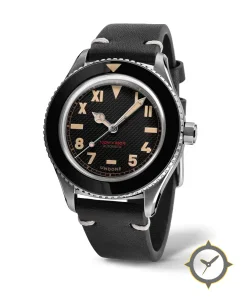 A Dive watch with a vintage-inspired 37mm case, crafted from stainless steel featuring a black dial with a unique hobnail finish.