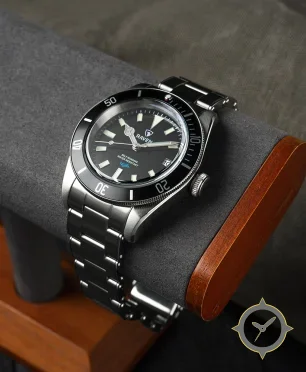 A Dive watch with a bold 42.5mm presence on the wrist, crafted from stainless steel featuring a black dial with a unique glossy finish.