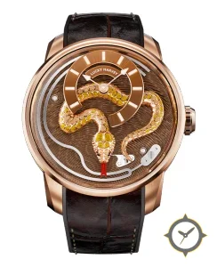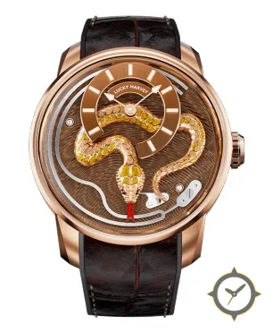 A Luxury watch with a bold 48.5mm presence on the wrist, crafted from gold featuring a brown dial with a unique engraved guilloché / textured relief finish.