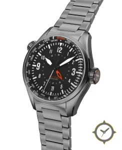 A GMT watch with a versatile 39mm case, that suits most wrists, crafted from stainless steel featuring a black dial with a unique matte finish, perfect for the global traveler with its world-time function.