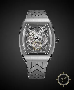 A Skeleton watch, crafted from stainless steel featuring a black dial with a unique open-worked / skeletonized finish.