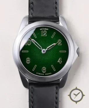 A Dress watch, crafted from stainless steel featuring a green dial with a unique vitreous enamel finish.