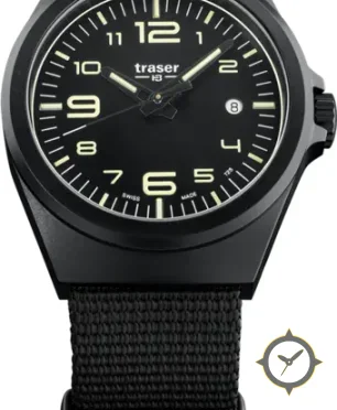A Military watch with a vintage-inspired 34mm case, crafted from stainless steel featuring a black dial with a unique matte finish.