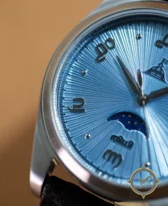 A Dress watch with a bold 45.5mm presence on the wrist, crafted from stainless steel featuring a blue dial with a unique radial sunburst / guilloché finish and a beautiful moonphase display.