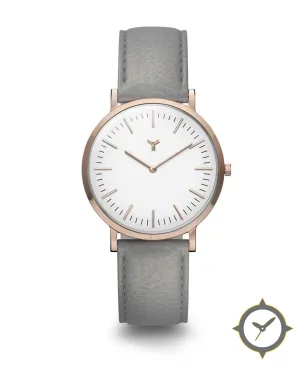 A Minimalist watch with a vintage-inspired 35mm case, crafted from stainless steel featuring a white dial with a unique matte finish.