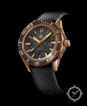A Dive watch with a bold 45.5mm presence on the wrist, crafted from bronze featuring a black dial with a unique meteorite-style textured finish finish.