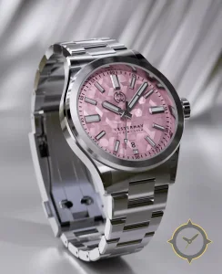 A Dive watch with a versatile 39mm case, that suits most wrists, crafted from stainless steel featuring a crimson dial with a unique 3D geometric mosaic (tessellated cube texture) finish.
