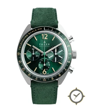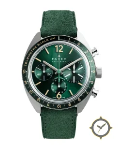 A Chronograph watch with a vintage-inspired 34.5mm case, crafted from stainless steel featuring a green dial with a unique sunburst finish.