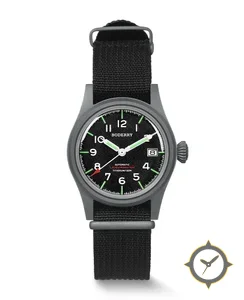 A Field watch with a vintage-inspired 34mm case, crafted from titanium featuring a black dial with a unique matte grained finish.