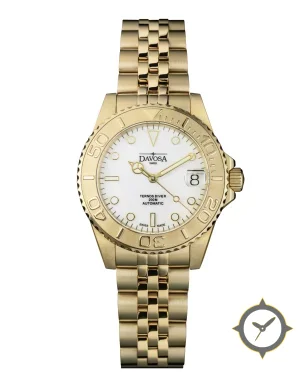 A Dive watch with a vintage-inspired 34.5mm case, crafted from Coating featuring a white dial with a unique glossy finish.
