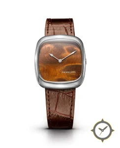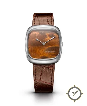 A Dress watch with a vintage-inspired 34.5mm case, crafted from stainless steel featuring a brown dial with a unique wood-grain finish.