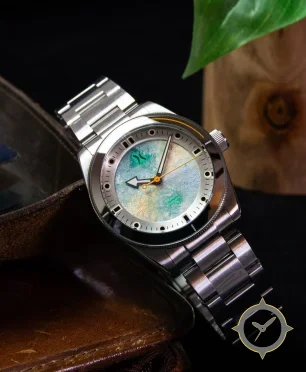 A Sports watch with a vintage-inspired 32.5mm case, crafted from stainless steel featuring a turquoise dial with a unique textured, patina-like stone finish finish.