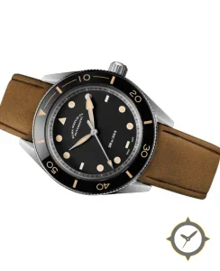 A Dive watch with a vintage-inspired 35mm case, crafted from stainless steel featuring a black dial with a unique matte finish.