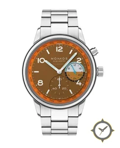 A World Timer watch with a vintage-inspired 33.5mm case, crafted from stainless steel featuring a brown dial with a unique matte lacquer finish, perfect for the global traveler with its world-time function.