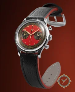 A Chronograph watch with a vintage-inspired 32.5mm case, crafted from stainless steel featuring a red dial with a unique glossy lacquer finish.