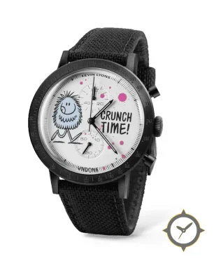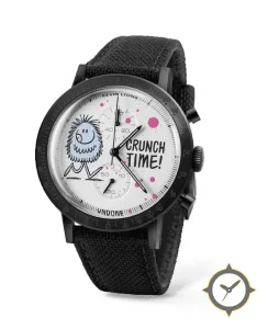 A Racing watch with a vintage-inspired 33.5mm case, crafted from stainless steel featuring a white dial with a unique printed cartoon illustration with paint-splatter accents finish.