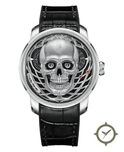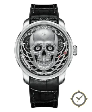 A Luxury watch with a bold 46mm presence on the wrist, crafted from stainless steel featuring a black dial with a unique sculpted 3D metal skull over textured lattice background finish.