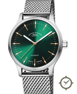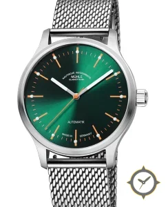 A Minimalist watch with a bold 47.5mm presence on the wrist, crafted from stainless steel featuring a green dial with a unique sunburst finish.