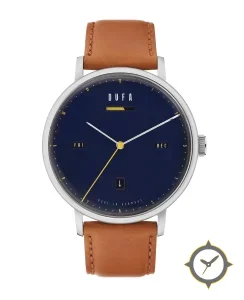 A Minimalist watch with a vintage-inspired 37.5mm case, crafted from stainless steel featuring a blue dial with a unique lacquer finish and a helpful power reserve indicator.