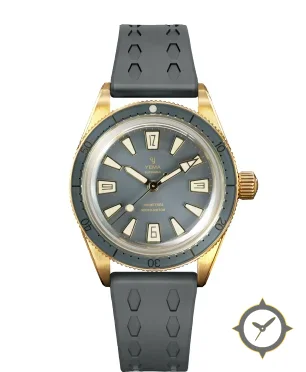 A Dive watch with a vintage-inspired 36mm case, crafted from bronze featuring a gray dial with a unique matte finish.