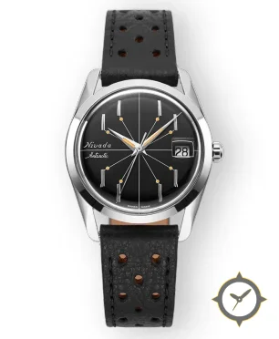 A Vintage watch with a versatile 38mm case, that suits most wrists, crafted from stainless steel featuring a black dial with a unique glossy lacquer finish.