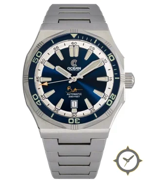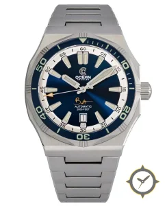 A Dive watch with a vintage-inspired 36mm case, crafted from stainless steel featuring a blue dial with a unique sunburst finish.