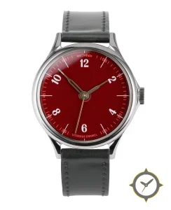 A Dress watch with a vintage-inspired 32.5mm case, crafted from stainless steel featuring a red dial with a unique vitreous enamel finish.