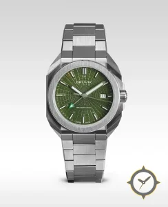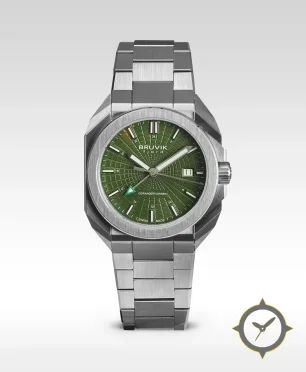 A GMT watch with a bold 48mm presence on the wrist, crafted from stainless steel featuring a green dial with a unique radial grid / guilloché texture finish and a true GMT complication for tracking a second time zone.