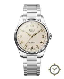 A Dress watch with a vintage-inspired 33mm case, crafted from stainless steel featuring a white dial with a unique subtle guilloche / textured grain finish.