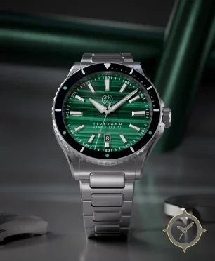 A Dive watch with a bold 42.5mm presence on the wrist, crafted from stainless steel featuring a green dial with a unique malachite-banded finish.