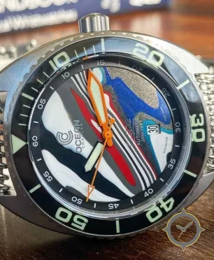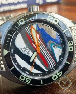 A Dive watch with a bold 44.5mm presence on the wrist, crafted from stainless steel featuring a black dial with a unique marbled / swirl multicolor pattern with contrasting painted segments finish.
