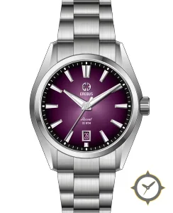 A Dress watch with a bold 44.5mm presence on the wrist, crafted from stainless steel featuring a purple dial with a unique sunburst finish.