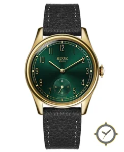 A Dress watch with a vintage-inspired 28.5mm case, crafted from gold featuring a green dial with a unique sunburst / radial gradient finish.