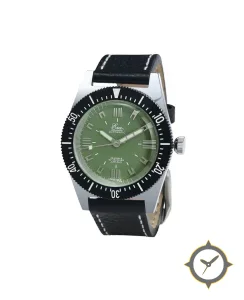 A Dive watch with a vintage-inspired 30.5mm case, crafted from stainless steel featuring a green dial with a unique sunburst finish.
