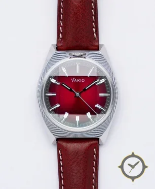 A Dress watch with a bold 45mm presence on the wrist, crafted from stainless steel featuring a crimson dial with a unique sunburst finish.