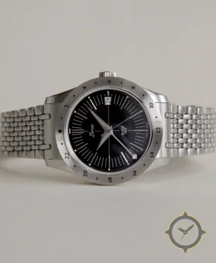A GMT watch with a versatile 39mm case, that suits most wrists, crafted from stainless steel featuring a black dial with a unique sunburst finish and a true GMT complication for tracking a second time zone.