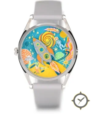 A Aviation watch with a versatile 38.5mm case, that suits most wrists, crafted from stainless steel featuring a blue dial with a unique printed-illustration finish.