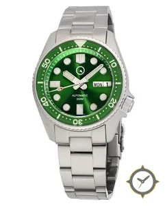 A Dive watch with a vintage-inspired 32.5mm case, crafted from stainless steel featuring a green dial with a unique sunburst finish.