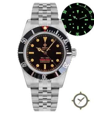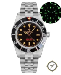 A Dive watch with a vintage-inspired 35.5mm case, crafted from stainless steel featuring a black dial with a unique glossy finish.